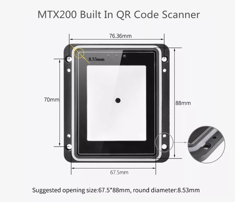 MTX200 is an embedded QR code scanner, which adopts the self-developed core decoding technology, and can support the rapid reading of one-dimensional code and QR code systems at the same time. Its surface is made of tempered glass, which has good light transmittance, scratch resistance, and fall resistance. It can be used for multiple purposes. If you need this QR code scanner for the turnstile, please contact us.